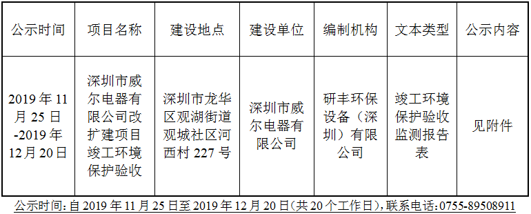 深圳市威尔电器有限公司改扩建项目竣工环境保护验收监测报告表公示