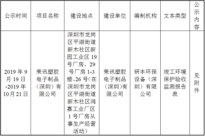 荣讯塑胶电子制品(深圳)有限公司技术改造项目竣工环境保护验收监测报告表公示