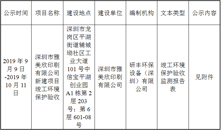 深圳市雅美欣印刷有限公司 新建项目竣工环境保护验收监测报告表公示