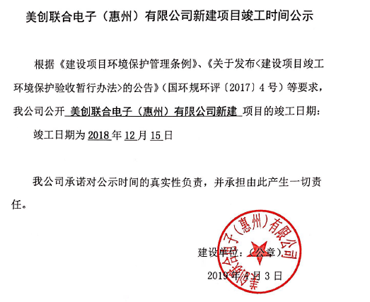 美创联合电子(惠州)有限公司新建项目竣工时间公示